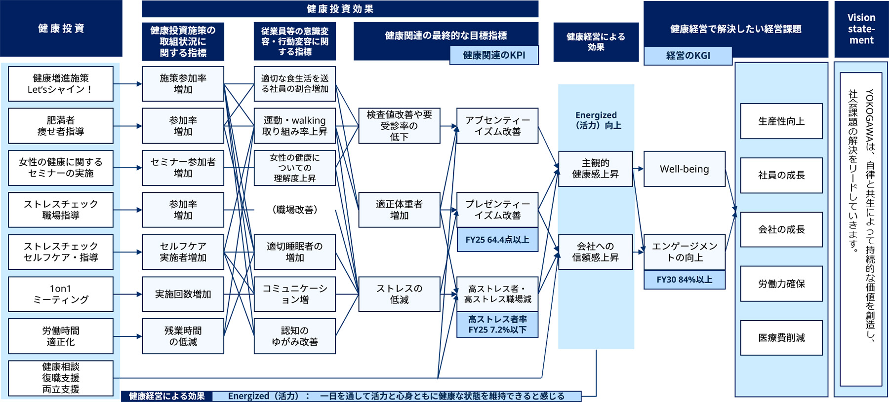 YOKOGAWAは、長期経営構想においてサステナビリティ目標の一つにエンゲージメントを、また、中期経営計画においても人的資本の施策の一つとしてWell-beingとエンゲージメントの向上を掲げています。横河電機は健康経営を組織の活力と生産性向上の基盤として位置づけ、この考え方に基づく施策の推進を通じて経営目標の達成を後押ししています。