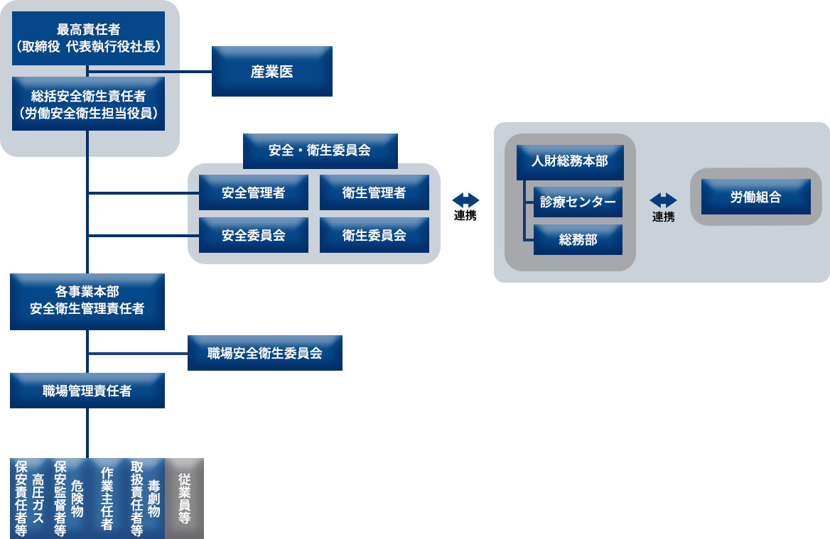 - 労働・安全衛生管理体制を確立し、役割、権限および責任を明確にし、労働・安全衛生活動を推進する。
