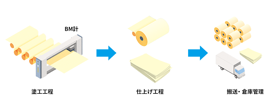 出来上がった紙の表面に塗料を塗り、紙の表面を加工するのが塗工工程です。塗工工程でもBM計が使われています。光沢を出すため、塗料に薬剤を添加します。製造する紙の種類によって異なる薬剤や配合で塗工し、熱風や赤外線などで乾燥させた後、仕上げ工程に進みます。