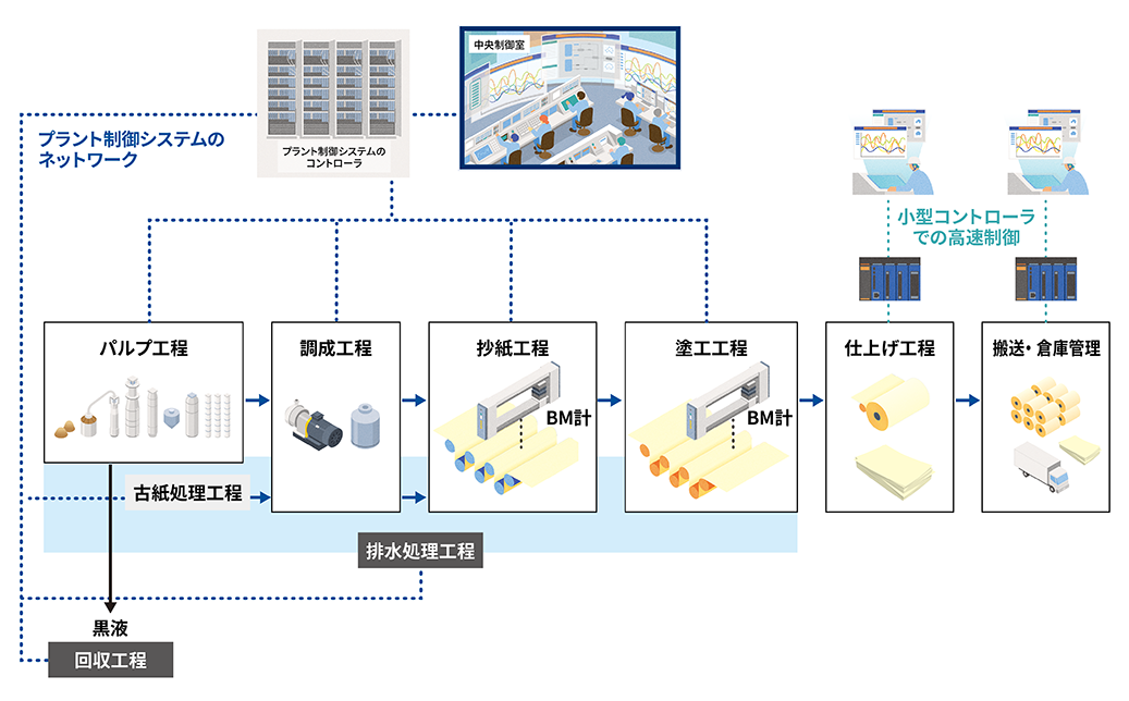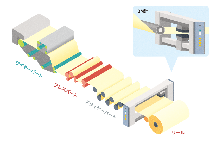 紙パルプ製造プラントでは、国内外から運ばれてきた木材チップや古紙を高温、高圧で溶かしてパルプ繊維を取り出し、 抄紙 工程でローラーを使って平らにして紙を製造しています。それぞれの工程には、計測機器や制御システムが取り付けられており、中でも特徴的なのがBM計です。紙の重量、水分量、厚さなどを計測し、基準値内に収まっていない場合には、制御システムで機械の動きを修正し、求められた品質特性の紙に仕上げて出荷します。