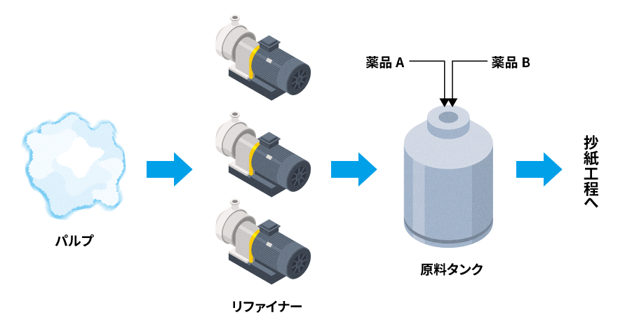 生成されたパルプは、調成工程に送られます。リファイナーの中で、パルプの繊維を機械でたたき押し潰す 叩解 と呼ばれる作業を行い、製造する紙の種類に応じて叩解の度合いを調節して紙の強度を高めていきます。その後、求められている紙の品質や機能に合った薬品を配合し、原料タンクに投入します。YOKOGAWAのシステムが原料や薬品の配合比率、添加量、配合状態などを制御します。