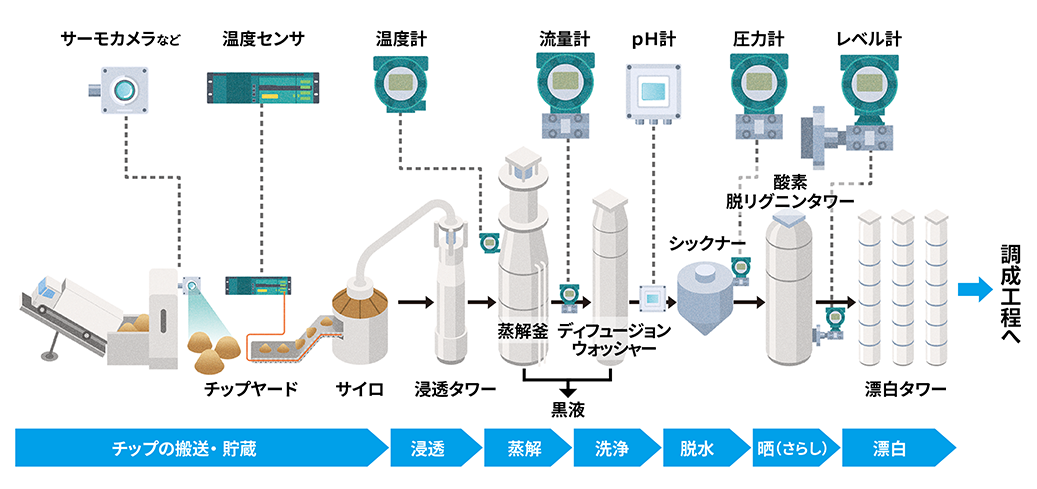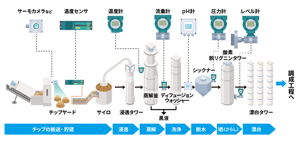 パルプ工程では、流量計、レベル計、圧力計、pH計、温度センサなどが計測したさまざまなデータを元に、設備が制御されています。中でも、パルプの原料である木材チップの取り扱い工程では常に火災のリスクがあり、注意が必要です。チップヤードでは監視カメラやサーモカメラで常時監視し、ベルトコンベアでは温度センサが温度の上昇を検知しています。現場の状況を把握し、適切な対応が取れるように、YOKOGAWAの監視システムが導入されています。