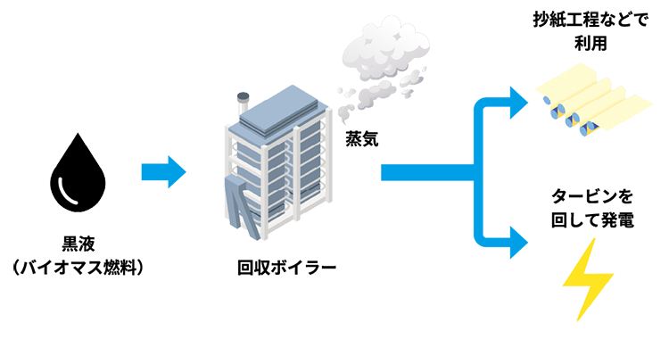 木くずや紙くず、プラスチックなどの廃棄物に加えて、蒸解釜で繊維(セルロース)を取り出す時に黒液と呼ばれる廃液も発生します。水分を蒸発させて濃縮した黒液をバイオマス燃料として焼却し、回収ボイラーで蒸気を発生させます。蒸気は抄紙工程などで利用したり、タービンを回して発電させたりします。