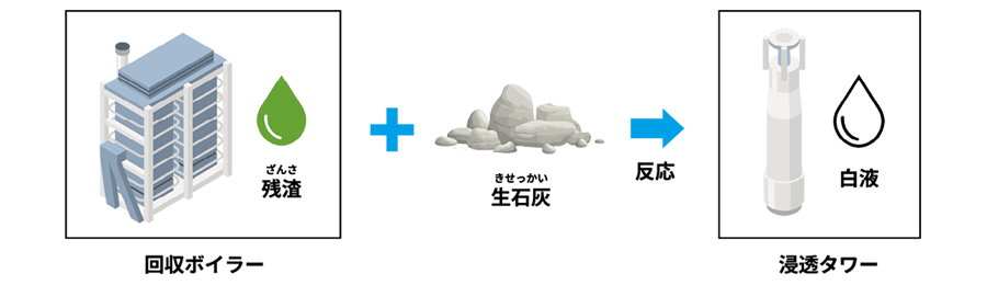 また、回収ボイラーの燃焼後に残った物質(残渣)は生石灰と反応させて白液として再生します。再生した白液は浸透タワーで再利用されます。