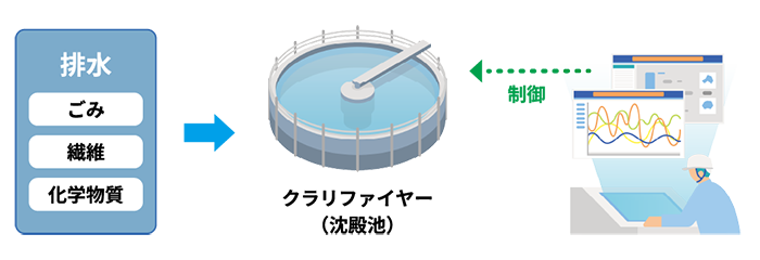 繊維、ごみ、化学物質などが含まれた排水はクラリファイヤーに集められ、高度な技術で適切に処理された後、再利用されます。排水処理時に発生する汚泥は焼却され、セメントの原料、土木資材などに有効利用されます。YOKOGAWAのシステムが、排水量の制御や水質を中和する薬品添加の制御などを行っています。
