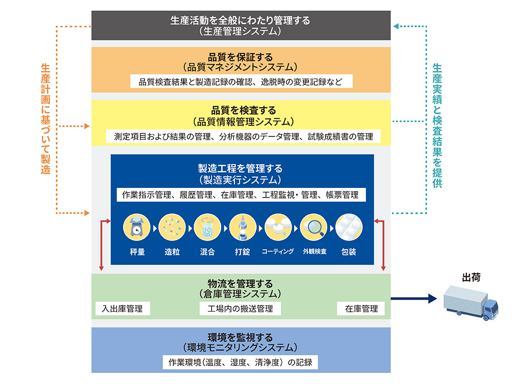 医薬品の製造にはさまざまな厳しい規制があり、製造管理や品質管理の徹底が求められます。製造実行システムは、製造計画に沿った製造の各工程における作業指示、実施内容、進捗状況、製造データを可視化、記録し、GMPに則った製造を可能にします。