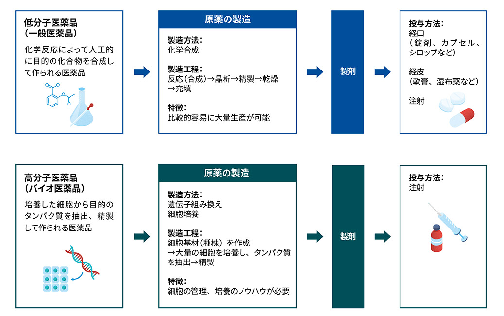 ※ここでは低分子医薬品(一般医薬品)と高分子医薬品(バイオ医薬品)について紹介します。