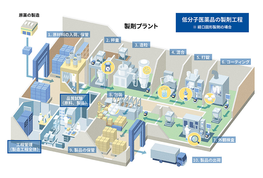 低分子医薬品のうち、経口固形製剤の場合、医薬品の有効成分となる原薬は製剤プラントに運ばれ、使用用途、期待される効果、投与後に効果が現れるタイミングなどに合わせて、適した形状の製剤に加工されます。製剤工程の担当者は原材料の種類、必要な量、作業手順を確認しながら、作業を進めていきます。作業記録は製造実行システムによって管理されます。品質試験の結果と製造実行システムの記録により、適切に製造されたかを確認した後、医薬品は出荷されます。